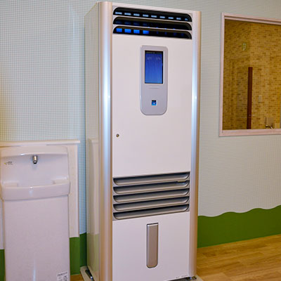 ピュアウォッシャーはテニスコート一面分の大空間をカバーできる業務用加湿空気清浄機です。